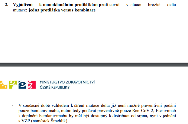 Vypíchnu monoklonály: V současné době vzhledem k šíření mutace delta již není možné preventivní podání pouze bamlanivimabu, nutno tedy podávat preventivně pouze Ren-CoV 2, Etesivimab k doplnění bamlanivimabu by měl být dostupný k distribuci od srpna, nyní v jednání s VZP.