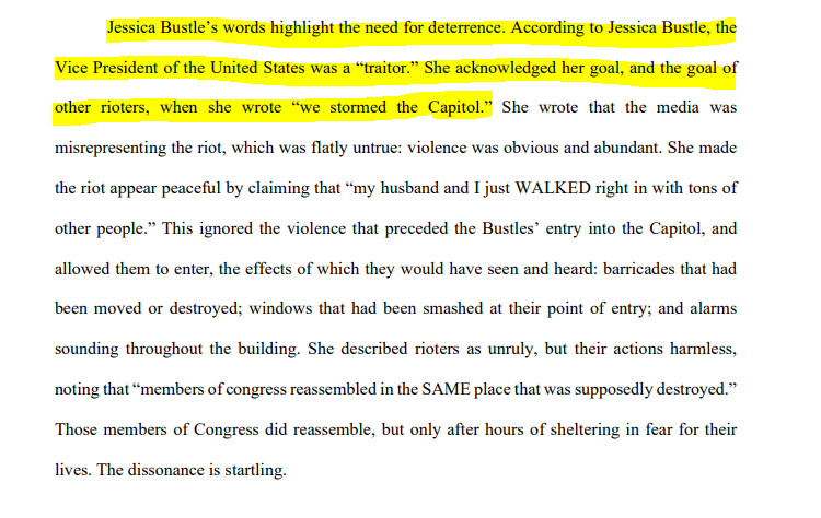 #CapitolRiot: The DOJ argues Jessica Bustle's posts after the riot – in which she both admitted she "stormed" the Capitol but also tried to downplay what happened – warrant a harsher sentence than the one it's requesting for her husband. @wusa9@EricFlackTV
