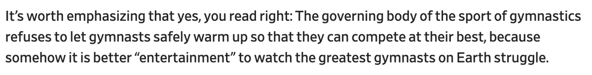 If you wonder why event finals look like everyone is falling over in terror, they are, and it's because the FIG thinks that letting athletes warm up would "irritate TV broadcasters."