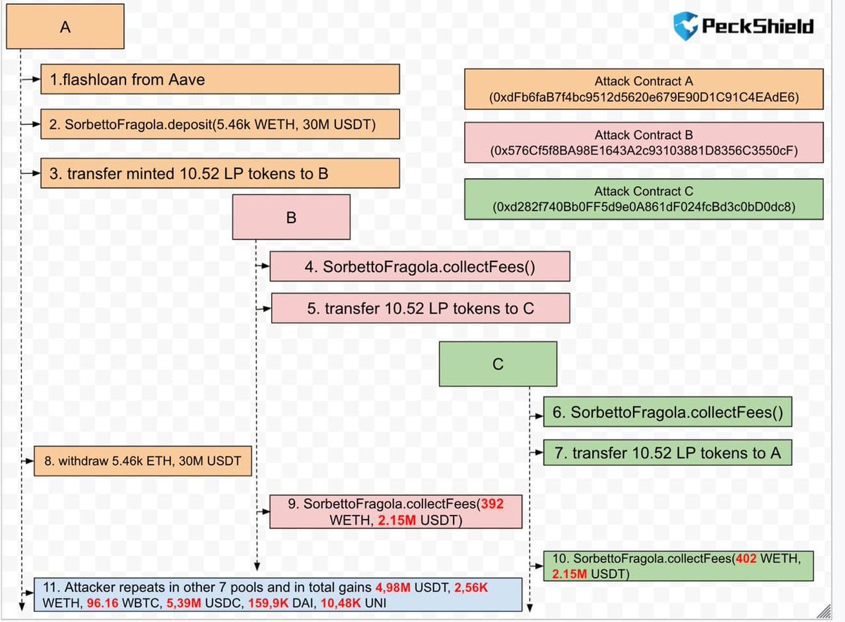 1/4 SorbettoFragola was exploited in etherscan.io/tx/0xcd7dae143…, resulting in the loss of about $20.7M including 2.6K WETH, 5.4M USDC, 5M USDT, 160K DAI,10K UNI, and 96 WBTC.