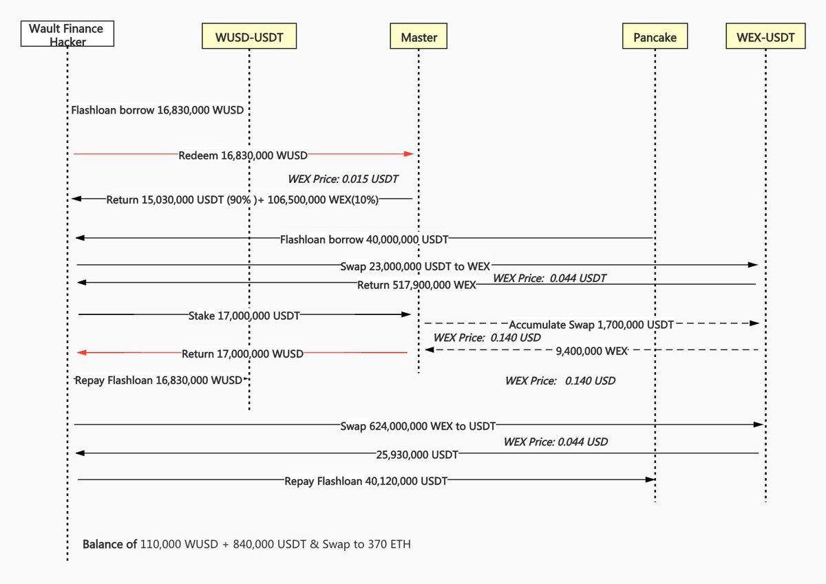 3/5 In the exploit, the hacker makes the first flashloan of 16M WUSD (and redeems the WUSD to 15M USDT and 106M WEX), then the second flashloan of another 40M USDT, and swaps 23M USDT to 518M WEX, resulting in an imbalanced USDT_WEX pair.
