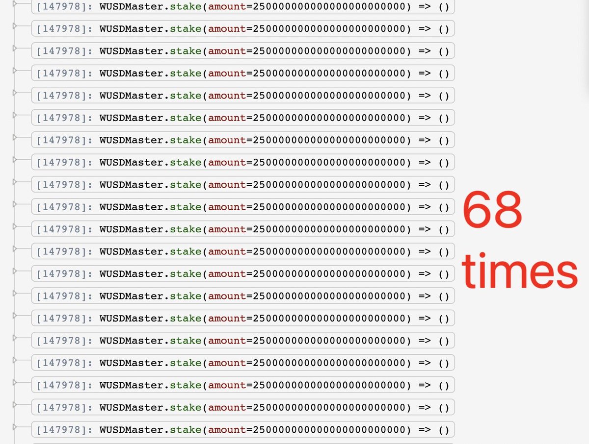 4/5 The attacker repeats stake() 68 times. Each time the WUSDMaster is coded (forced) to swap 10% of the staked USDT (250K) into WEX via the imbalanced USDT_WEX pair, which becomes even skewed. At the end, the attacker makes a reverse swap from WEX to USDT for profit.