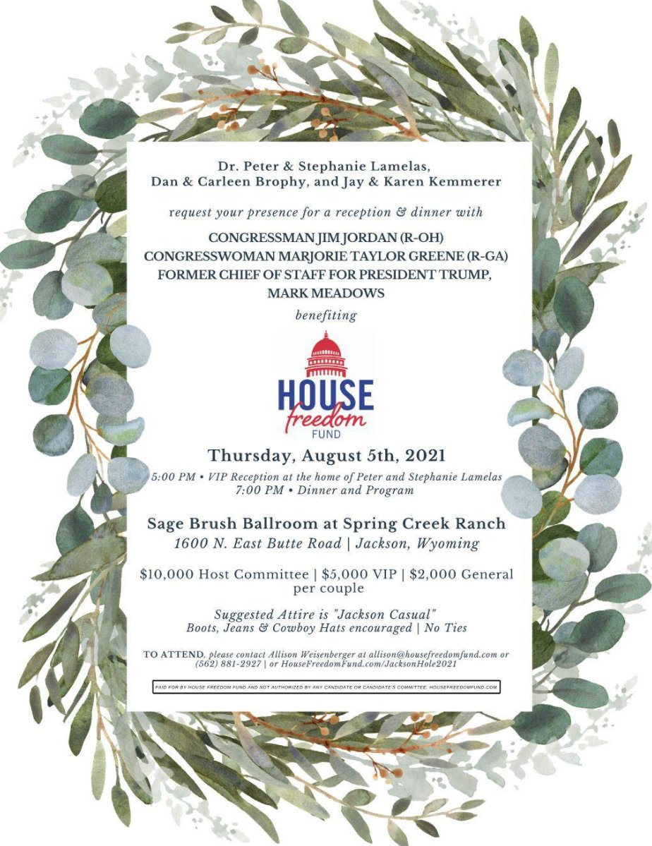 Former WH Chief of Staff Mark Meadows is headlining a fundraiser for the House Freedom Fund in Jackson Hole this Thursday with Jim Jordan and Marjorie Taylor Greene.