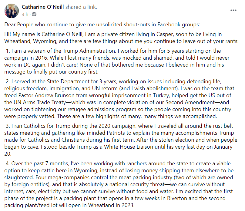 Catharine O'Neill -- rumored to be meeting with Trump in NJ last week as a potential challenger to Liz Cheney -- has popped up in one of Wyoming's largest conservative FB groups.