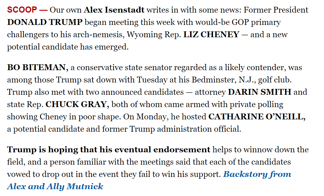 But O'Neill is interesting. She was relatively unknown in Wyoming during her time in the Trump admin. Was spotted working the camera at the Matt Gaetz anti-Cheney event this winter. Recently bought property in the state, and has been meeting with people who know a thing or two.