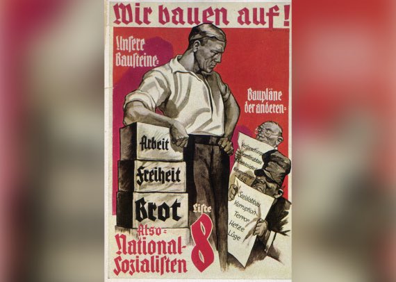 I’m going to show a campaign poster that is 89 years old. See if it has any themes that seem current and relevant. It’s in German. The National Socialist ideal is on the left. He promises Work, Freedom and Bread. He’s looking down on an anti Semitic caricature, deformed and
