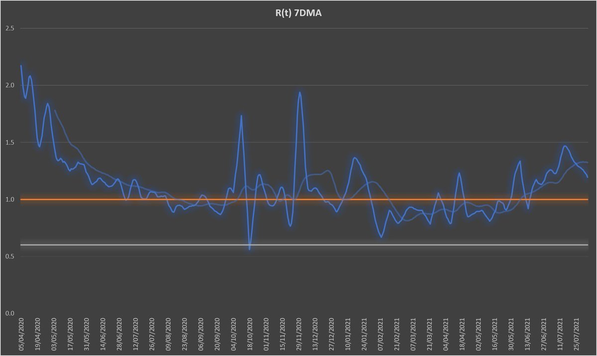Tasa de reproducción efectiva en promedio móvil a 7 días.