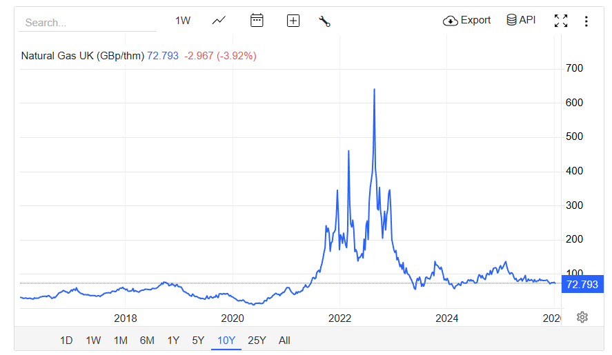 Here's the price of gas over the last ten years. There was a spike after lockdowns, often falsely attributed to Russia's invasion of Ukraine. There is no way that gas prices can account for energy bills going up as much as they have.