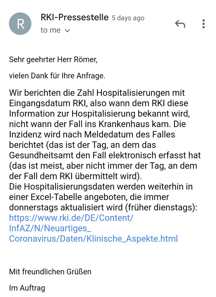 Die Datenqualität der Hospitalisierungsinzidenz ist noch viel schlechter als ich es mir vorstellen konnte: Krankenhausaufnahmen werden nur in die Hospitalisierungsinzidenz gezählt, solange das Testergebnis(melde)datum (nicht das Aufnahmedatum) in den letzten 7 Tagen lag. 1/