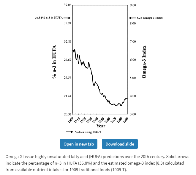 One estimate is that omega-3 index has declined by ~60% during the 20th century due to increasing seed oil consumption