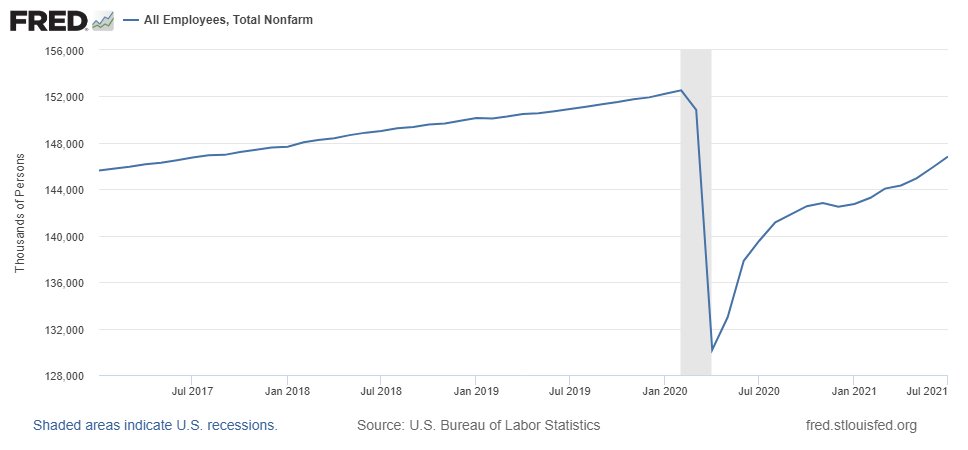 As good as today's numbers are, the U.S. still has 6 million fewer jobs than it did pre-pandemic, and is about 8 million below the pre-pandemic trend. The labor market is still in a pretty deep hole, and we need a lot more numbers like today before we celebrate anything.