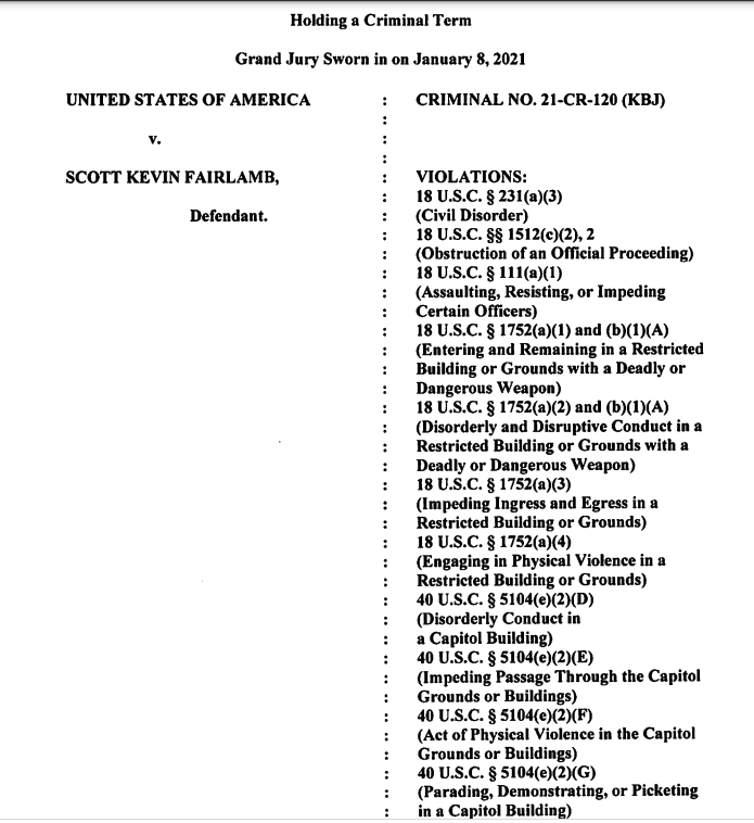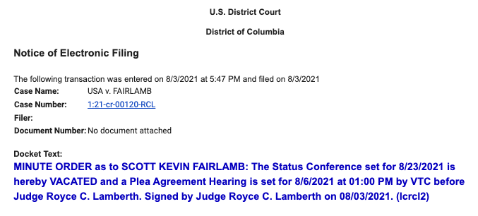 Fairlamb is one of several dozen Jan. 6 defendants in pretrial detention while his case is pending, so he's appearing for today's plea hearing by video from jail (I'm listening to the audio feed remotely so I can't see him, but they just noted that)