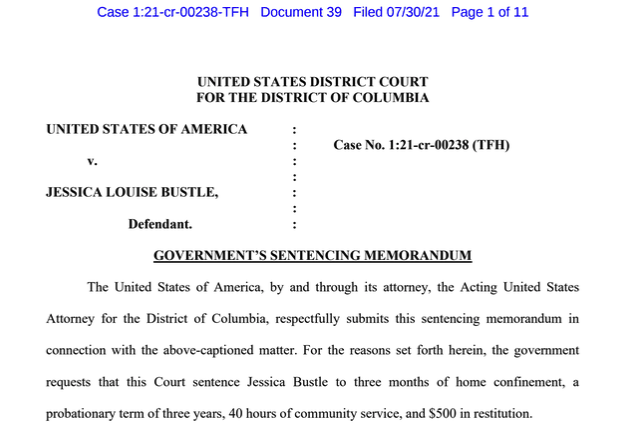 Hogan says there shouldn't be a presumption of probation as the punishment in these misdemeanor-only cases related to the Capitol riots, so he tasks the defense with explaining why the Bustles shouldn't get any jail time