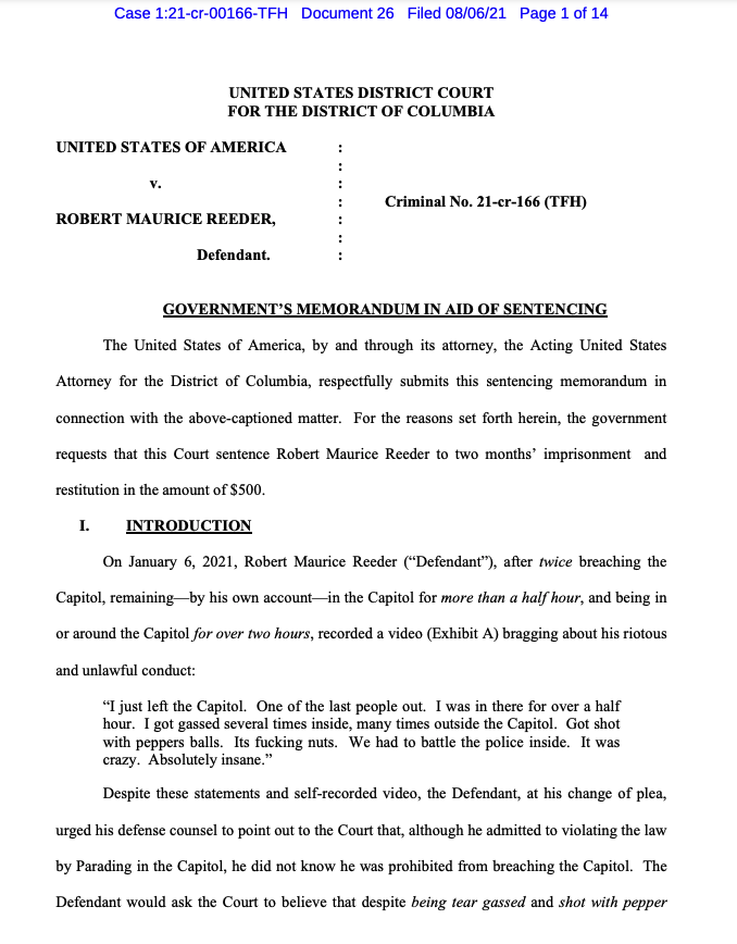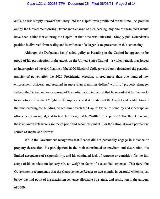 New: Prosecutors are arguing that Robert Reeder, who pleaded guilty to a misdemeanor re: Jan. 6, should spend two months in jail — despite his plea, they say, "he appears to be proud of his participation" s3.documentcloud.org/documents/2103…