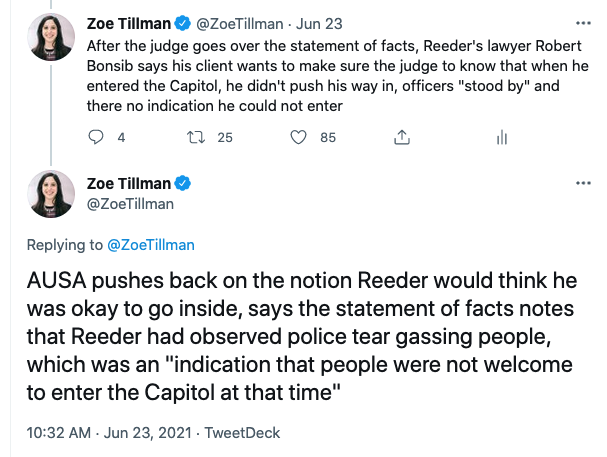 The govt highlights this exchange during the plea hearing in June where the AUSA called b.s. on Reeder's attempt at arguing he didn't think he was barred from going inside the Capitol