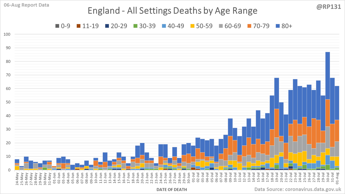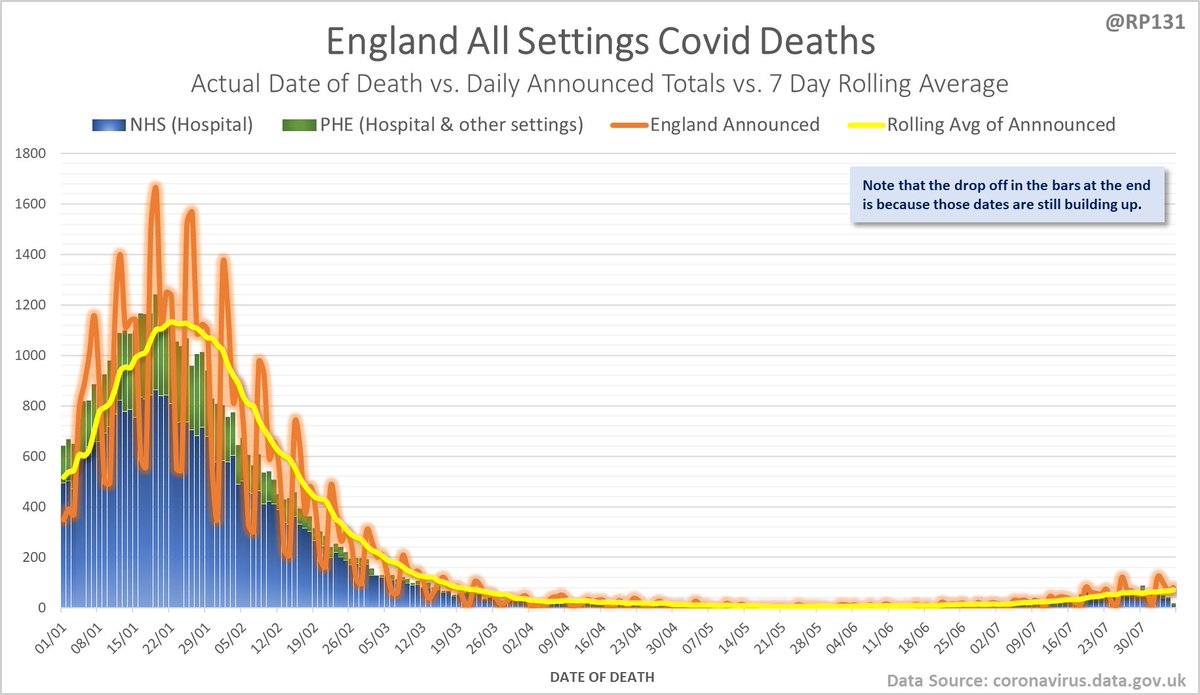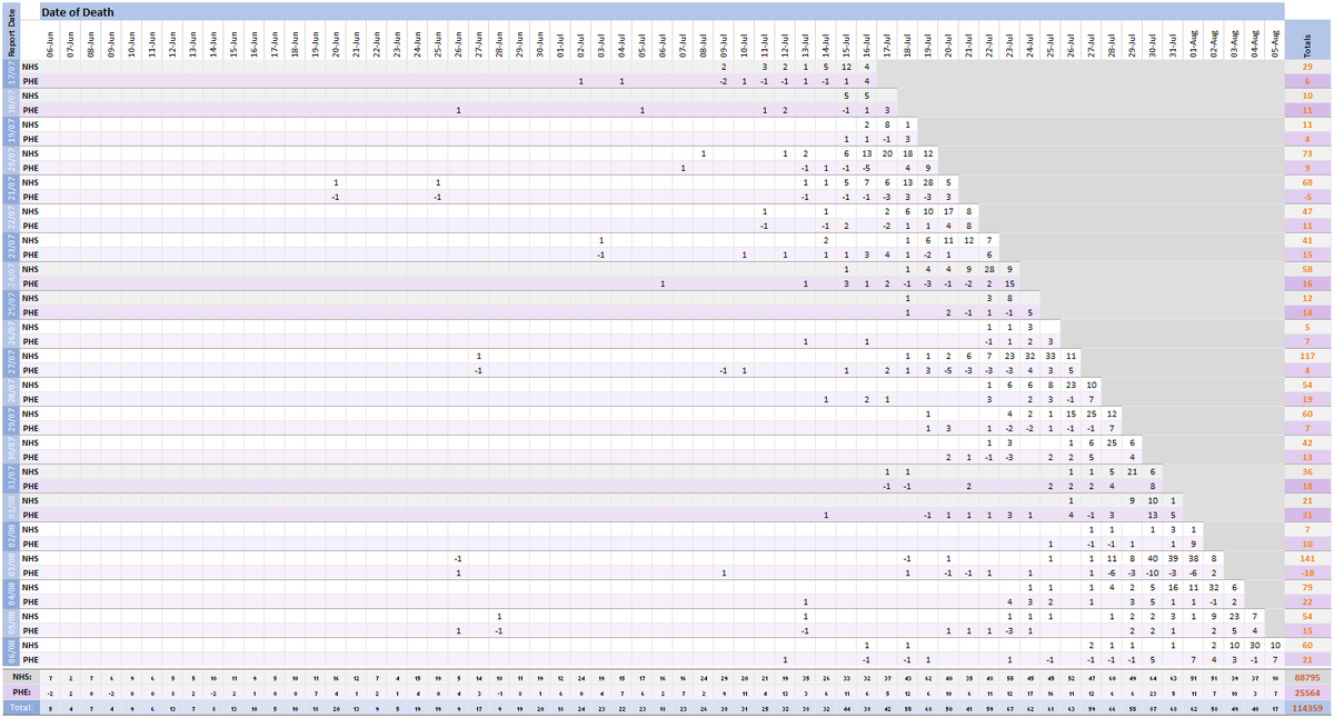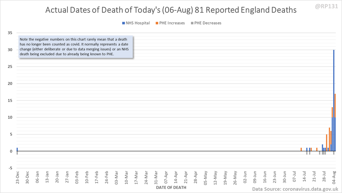 Pivot for 06-Aug to show breakdown of both 60 NHS and 21 (net) PHE deaths by date of death. The negatives are a combination of date of death corrections and accounting for NHS deaths that were already known to PHE. Small version for twitter first: