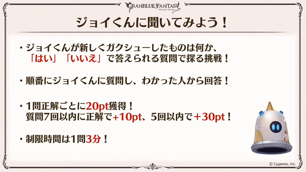 Joy has learned something new (the team will be given hints for the category), and the cast is allowed to ask Joy yes or no questions to find out what it is. Correct answer: 20 points. Within 7 questions, +10 points. Within 5 questions, +30.