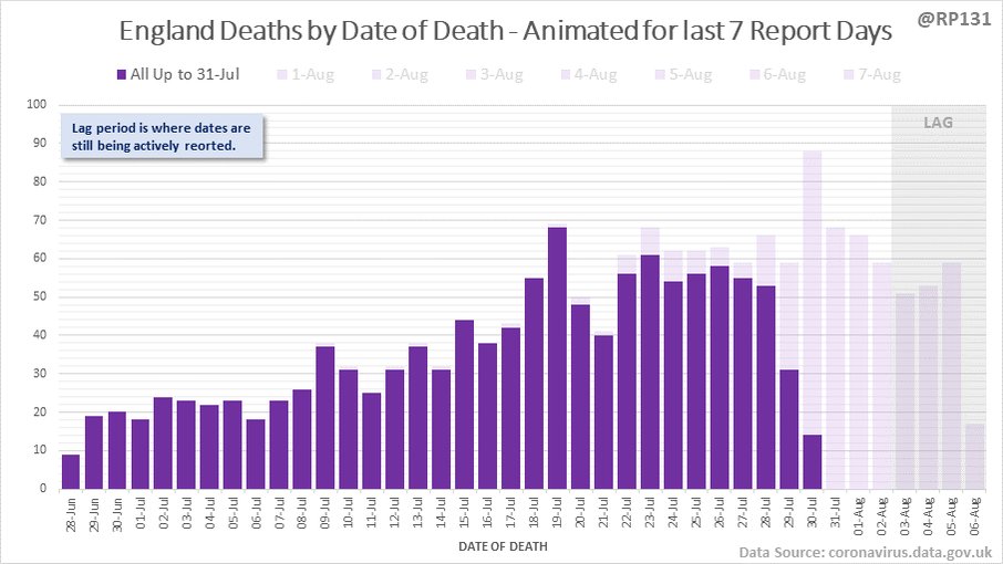 Animated chart to show how the #covid19uk deaths by date of death have been contributed to by reports over the last 7 days. Note this just includes England numbers as other nations don't always publish their date-of-death data every day.