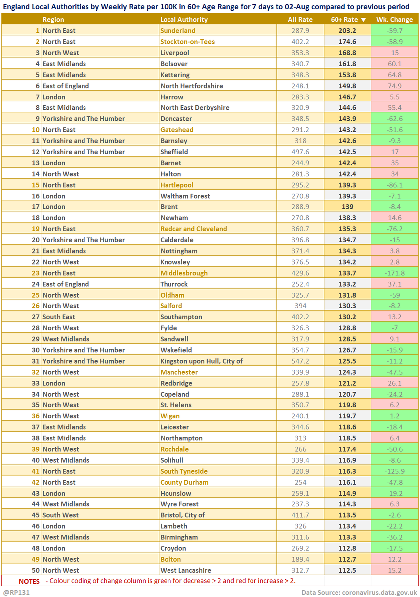 Top 50 table view of latest availble Local Authority data for the 60+ age range for 7 days to 02-Aug sorted by descending rate per 100K population (of that age range). Change column is compared to previous week with red for increase and green for decrease.