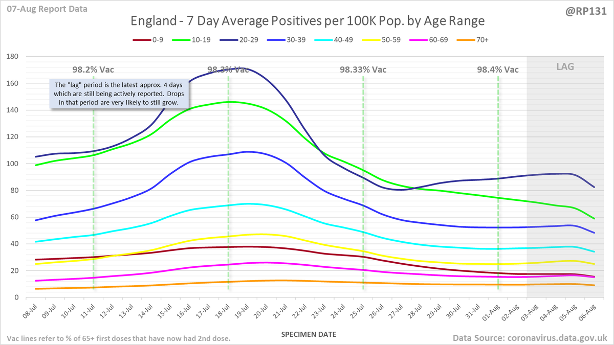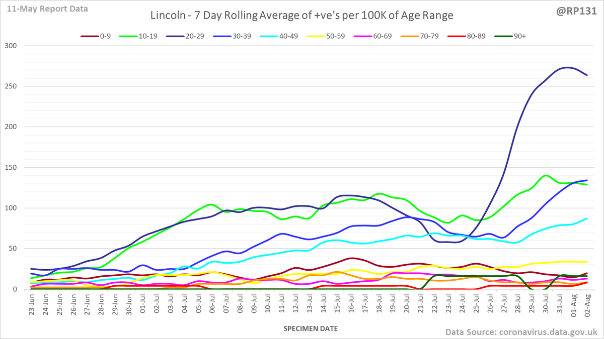 Age breakdown chart for Lincoln (current top LA). Rolling average of positive tests by specimen date per 100K population of each age range.