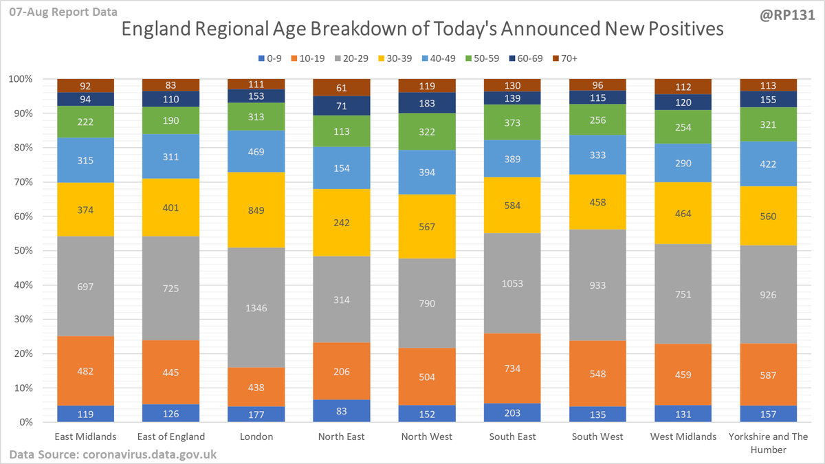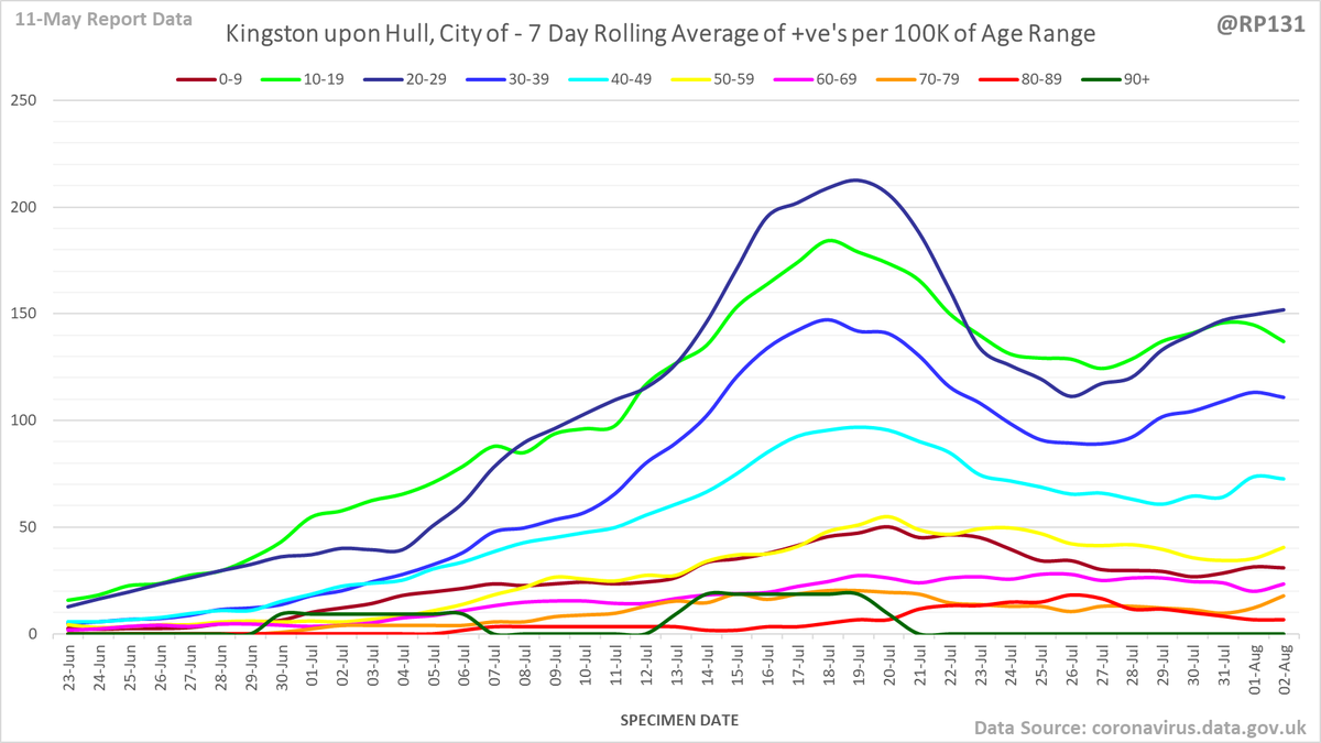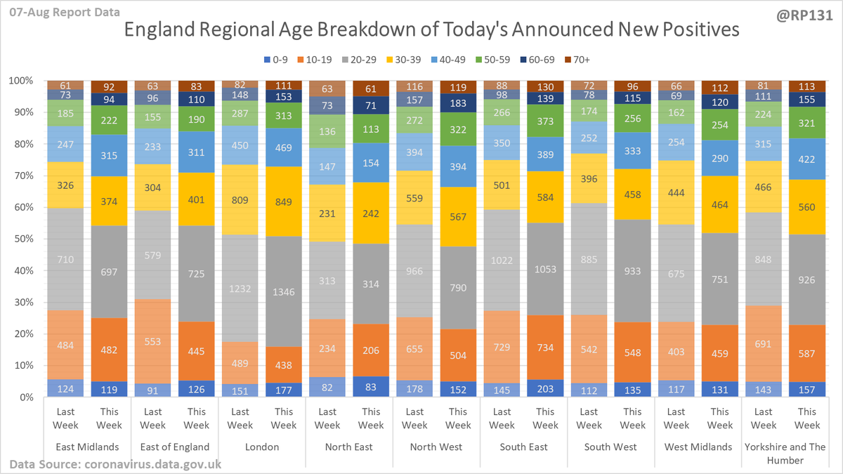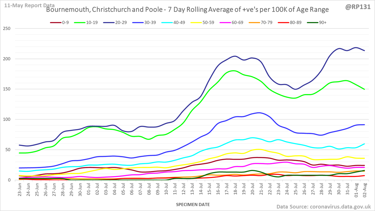 #covid19uk - Detailed positive tests thread. The majority of this thread is a set of views of rolling 7 day average positives per 100K by specimen date. Starting with England regions: