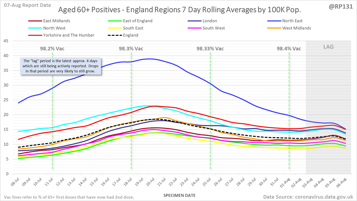 England regional rolling average positives (per 100K population) in the 60+ age range:
