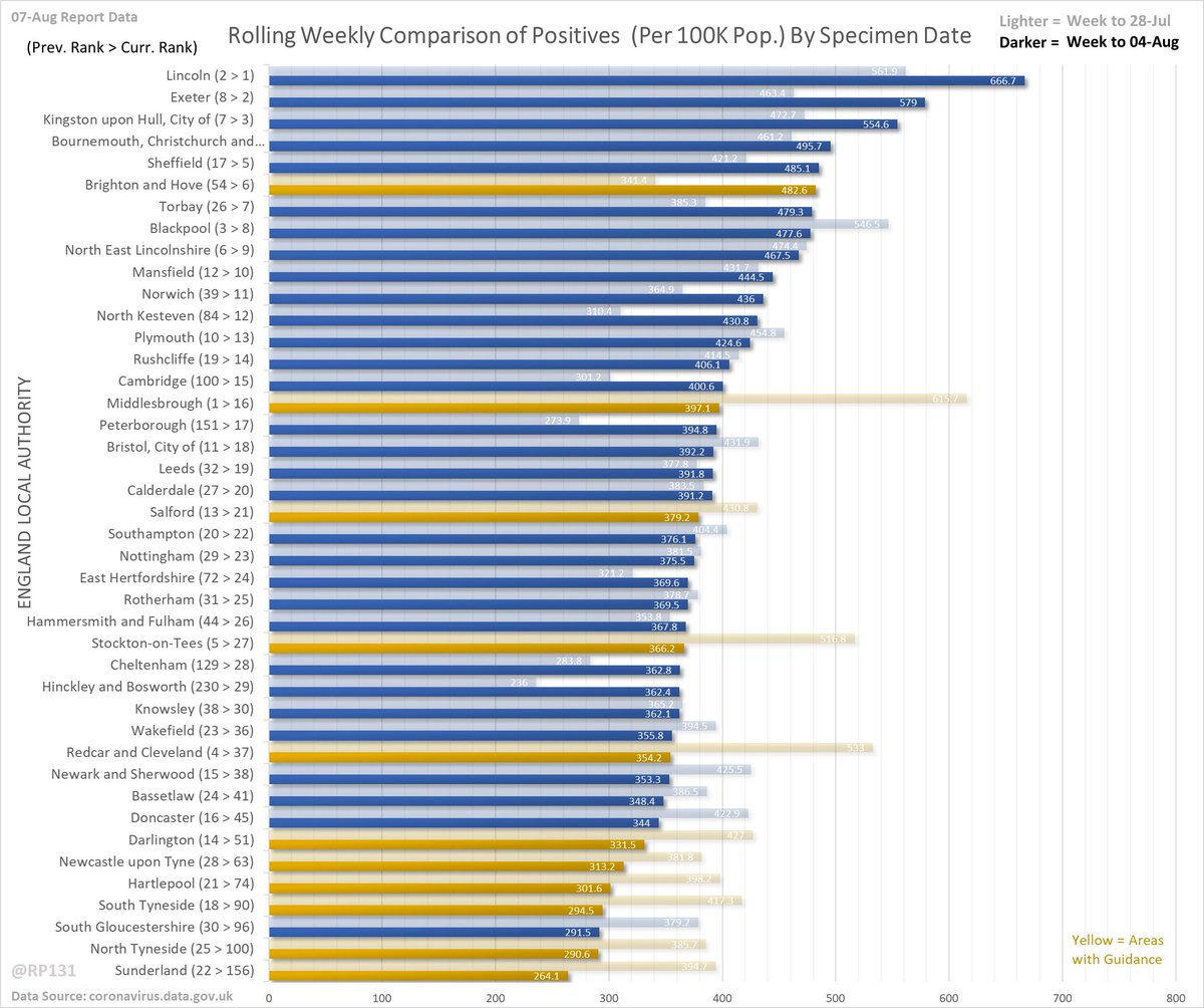 Rolling weekly comparison of totals up to 3 days ago. This chart is useful to see the relative movements of the local authorities towards the top of the list.