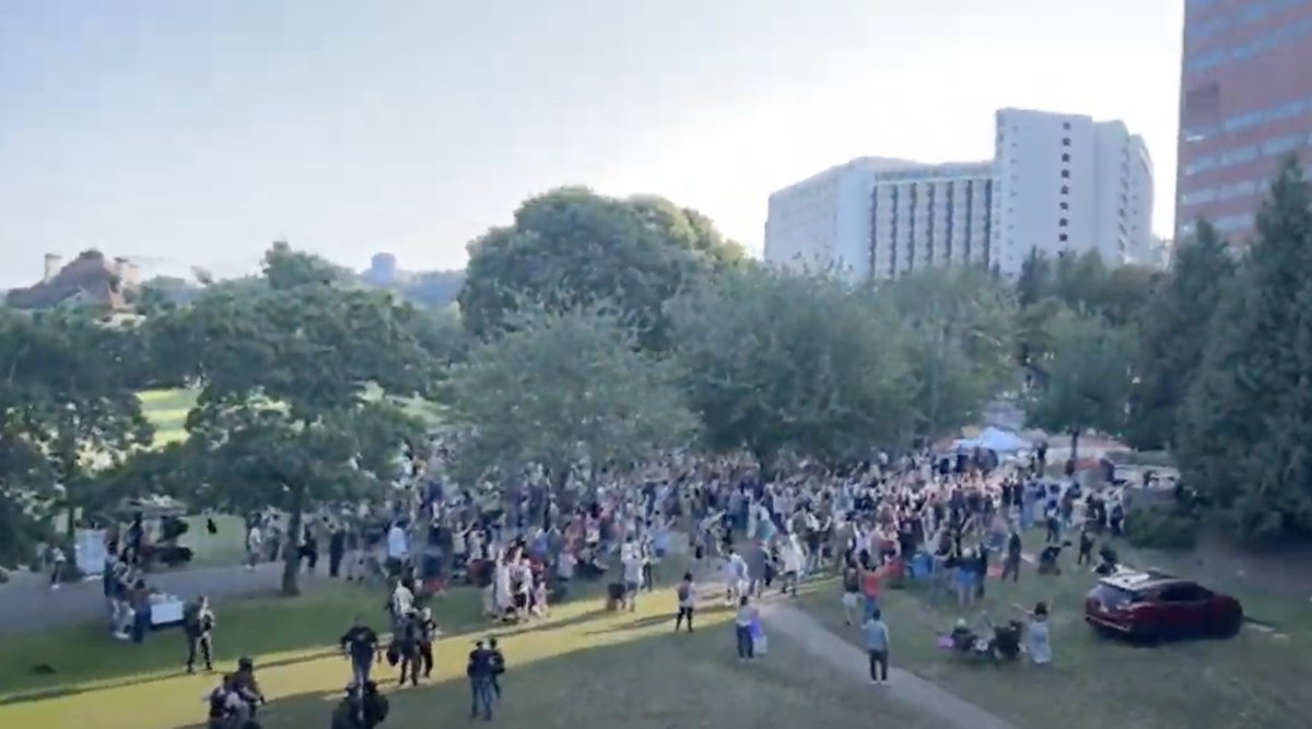 A large crowd has gathered for the "Let Us Worship" Evangelical Christian event in downtown Portland in response to antifa assaulting attendees of Saturday's family prayer event. There are many men volunteering as security this time around. Livestream: