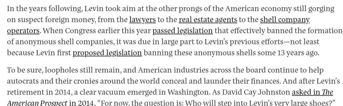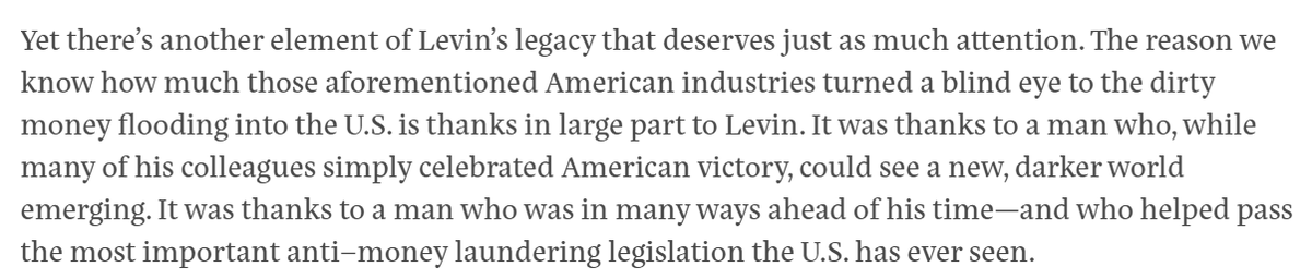 For @TheProspect, I wrote about the legacy of Sen. Carl Levin—a man ahead of his time, who could see how kleptocracy would rise, and who helped pass the most important anti-money laundering legislation the U.S. has ever seen. prospect.org/power/the-inve…
