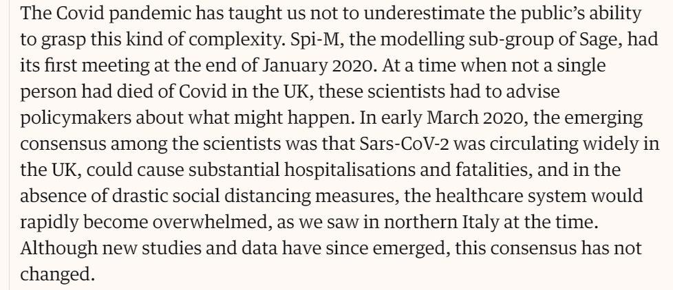 It pretends that there was no scientific disagreement, that there was no element of politicking and empire-building on the modellers' behalf. It pretends that it's not possible for scientists to put their thumbs on the scale.