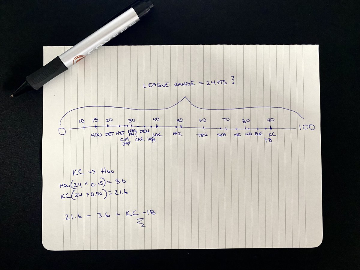 If you want to make a point spread for any matchup, just use the proportion of the league range the team takes up. For example, let's do HOU (rating of 15) vs KC (rating of 90) with a league range of 24.