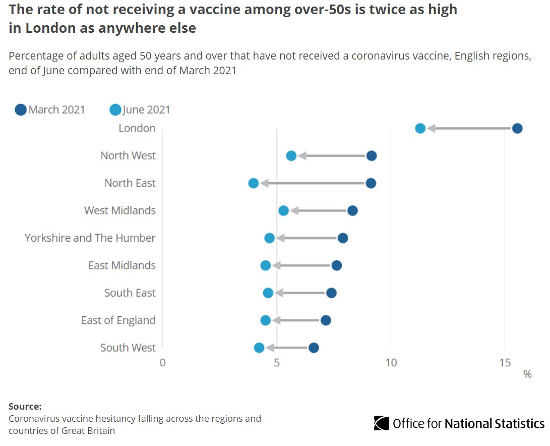 Vaccine uptake in London is behind other English regions per data from @PHE_UK
