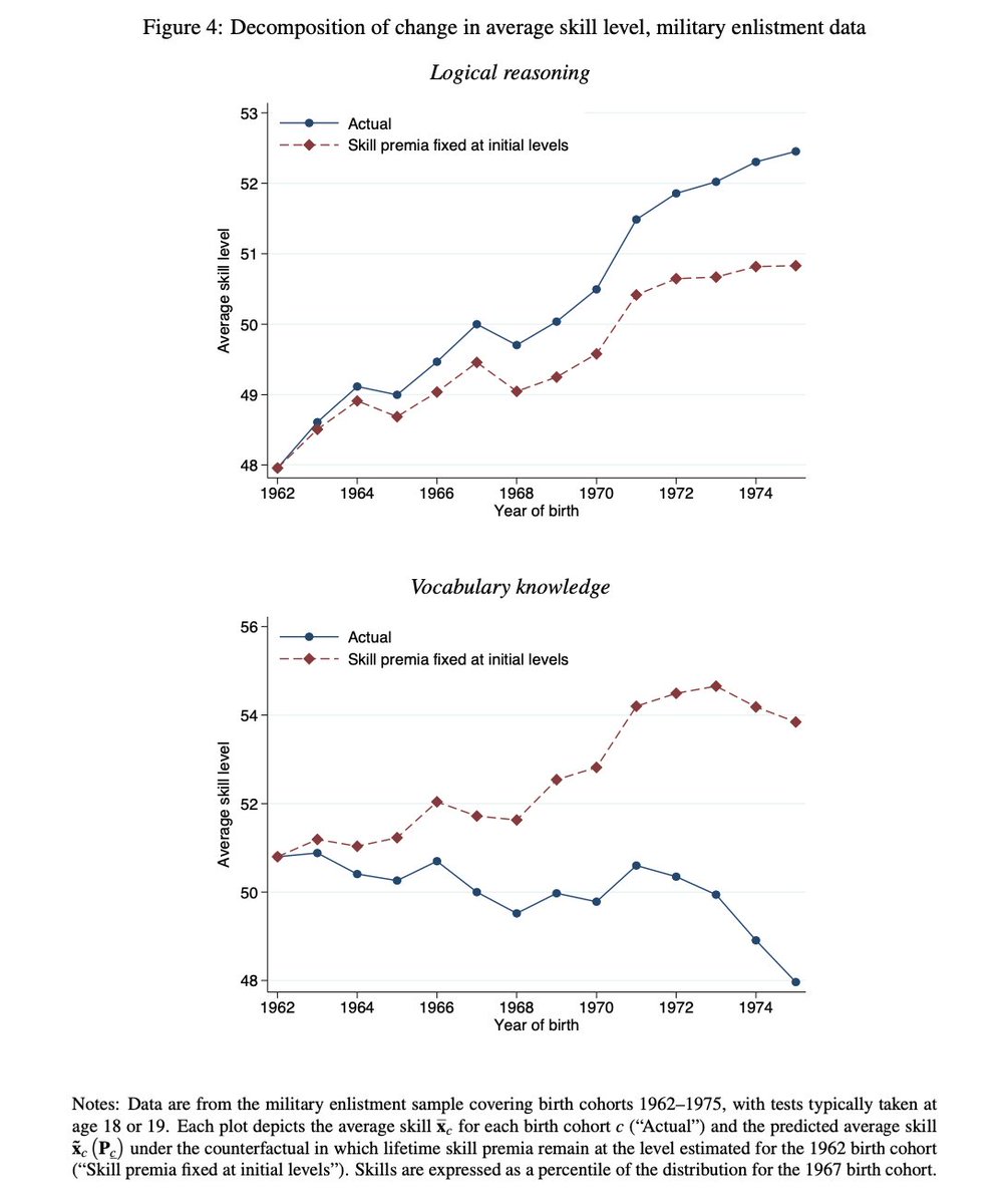 How much of these trends in skills are driven by changing returns? Comparing actual changes to a counterfactual where returns stay fixed over time, we find that changing returns can explain ~1/3 of the increase in fluid int. and the entire decrease in crystallized int. 8/10