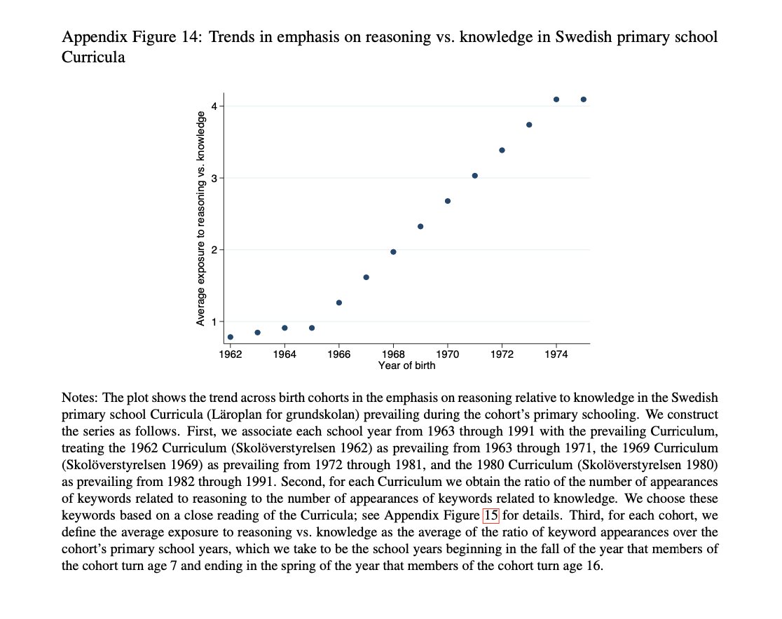 Using an original survey of Swedish parents and an analysis of primary school curricula in Sweden, we argue that our findings are consistent with schools and parents putting increasing emphasis over time on children developing reasoning skills over factual knowledge. 9/10