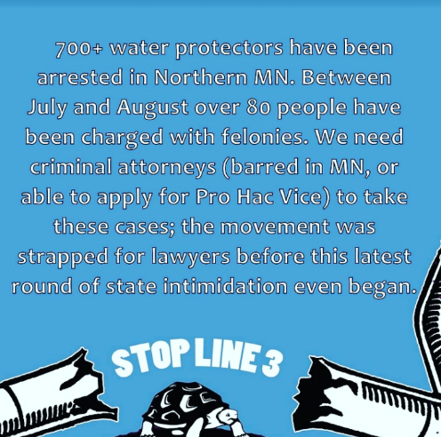 pic1: 700+ water protectors have been arrested in Northern MN. Between July and August over 80 people have been charged with felonies. We need criminal attorneys to take these cases; the movement was strapped for lawyers before this latest round of state intimidation even began