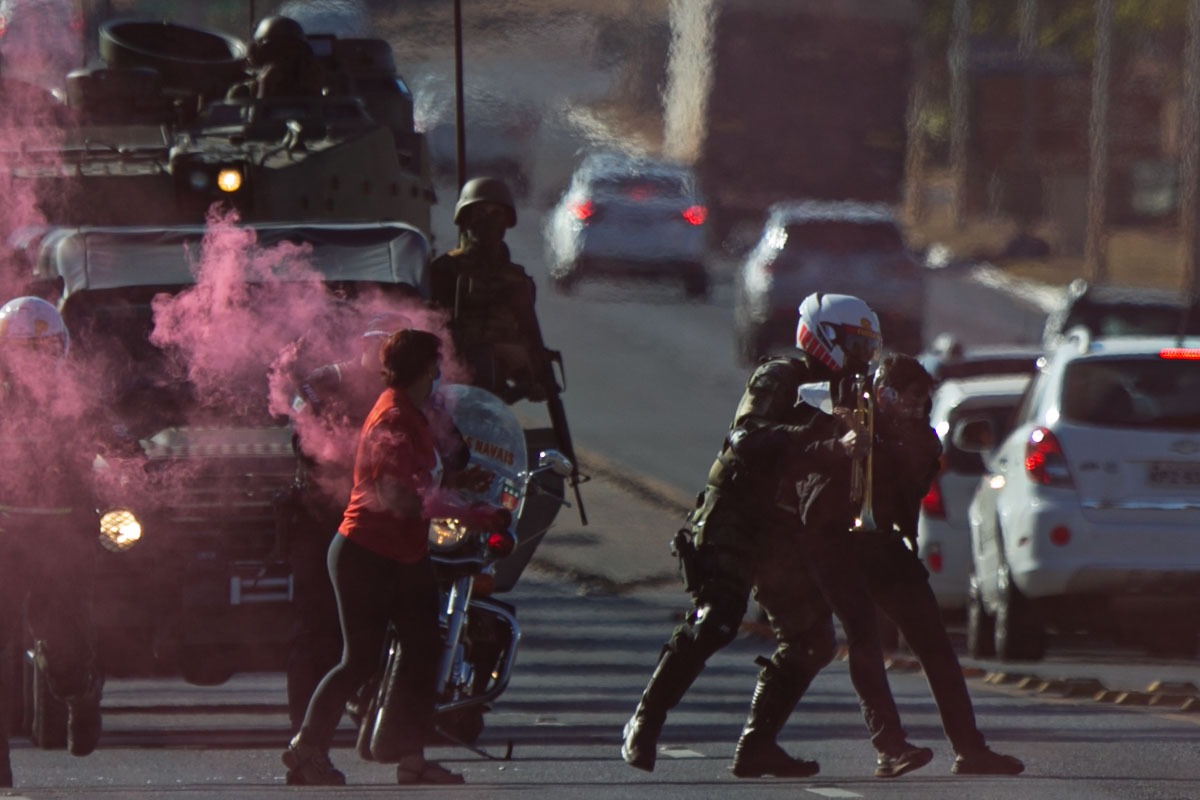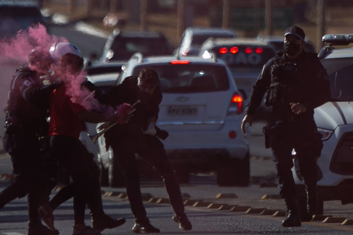 Manifestantes vestidos com camisas da Seleção Brasileira quebraram alguns carros estacionados em frente ao prédio da corporação e só pararam após serem interpelados por policiais, que dispararam tiros de bala de borracha.