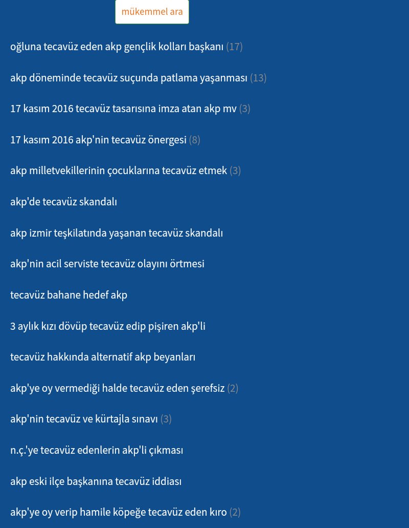 Ekşisözlük bu filtreleme sistemi ile okurlarından CHP'nin taciz ve tecavüz olaylarını gizliyor, bilmelerini öğrenmelerini istemiyor. Peki şimdi bir de Akparti başlıklarına bakalım. Arama motoruna Akp ve tecavüz kelimelerini yazdığımızda karşımıza 16 başlık çıkıyor.