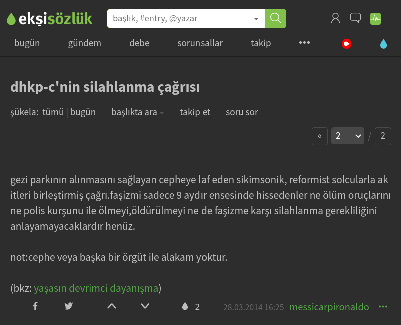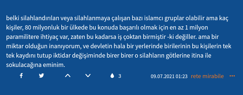 Silahlanma çağrısı yapan bir başlığın altında örgütlenme çağrısı da yapılıyor. Gençlerimiz bu şekilde yönlendiriliyor. Ekşisözlük'ün bu entrylere verecek cevabı var mı? Akparti entrylerini 10 dakika içinde tespit edip silen moderatör bu arşivi neden koruyor?
