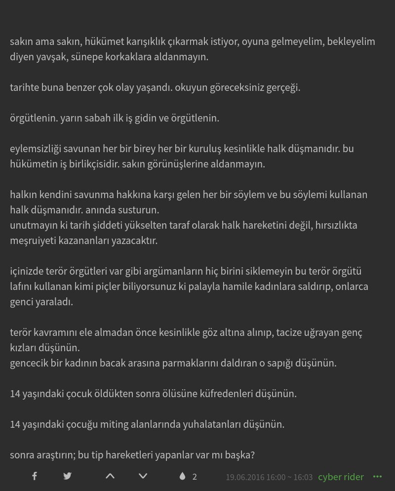 Bir ayaklanma başlarsa ordunun destek vereceği söyleniyor. Ayaklanma sırasında esnafa saldırılması gerektiği anlatılıyor. Bu Entryler farklı tarihlerde girilmiş olsa da okuyan için 10 dakika içinde edindiği bilgiler oluyor ve Ekşisözlük bu entryleri ısrarla silmiyor, Neden?