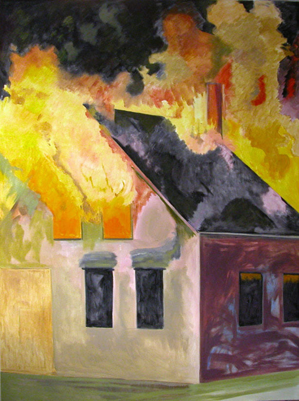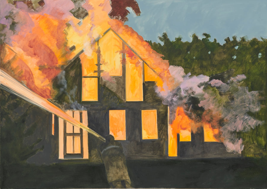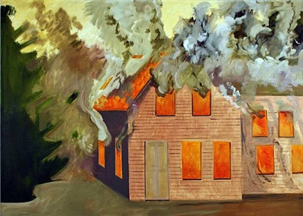 Lois Dodd, Burning House, Yellow Smoke (2007). Oil on panel.
