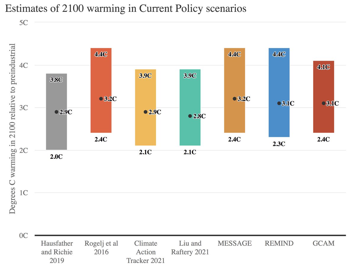 These energy system change matter; a sizable number of studies now suggest that the world is on track for around 3C warming by 2100 under current policies. This includes the very same IAMs (MESSAGE and REMIND) used to create to high-end RCP8.5 and SSP5-8.5 baseline scenarios. 6/