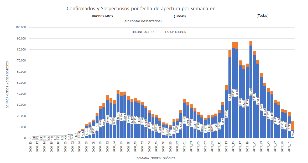 Confirmados y sospechosos por fecha de apertura en TOTAL, CABA y PBA.