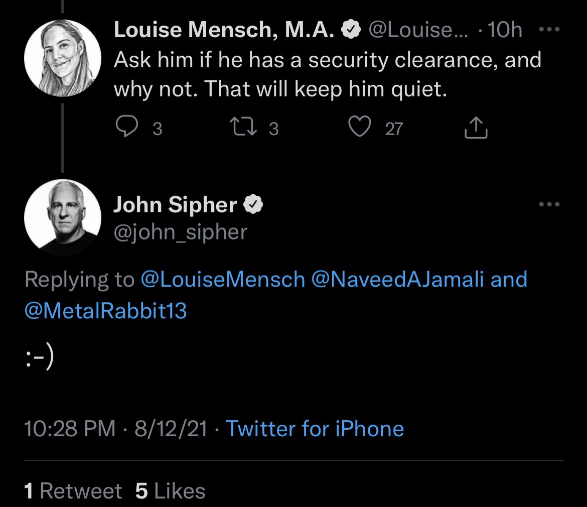 I did not have that former @CIA officer @john_sipher was aligned with racist troll Louise Mensch, who for years, tried to get my security clearance revoked. But alas, here we are. And yes, @MollyMcKew is a fraud that he has personal ties to.