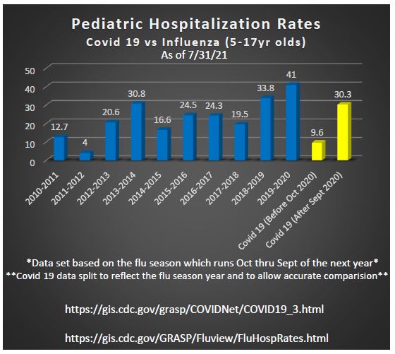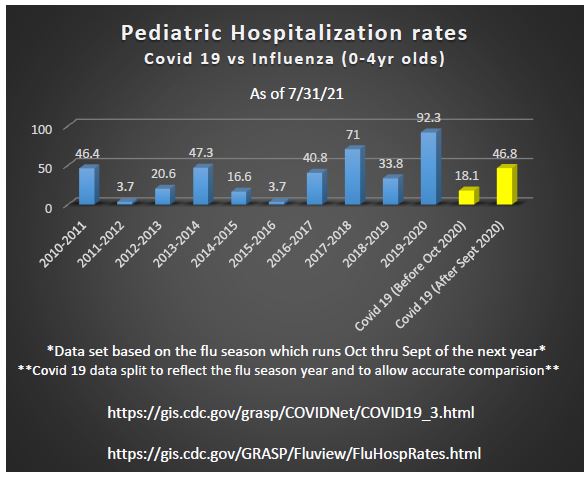 Now lets compare hospitalization rates of both the flu and #covid in children. As you can see below the covid rates are unremarkable compared to the past several flu seasons. And remember, this is with almost 27 million pediatric infections. 12/x