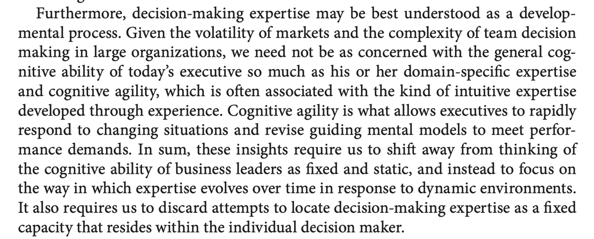 13/ This sort of gets at the heart of business expertise. In the late 2000s, @LiaDiBello4 argued that cognitive agility (the ability for one to update one's mental models in the face of new information) is a better predictor of business ability compared to problem solving ability