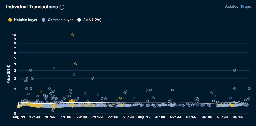 4. @PurrnelopesCC just sold out yesterday, so not much secondary data. Price floor is above the 0.08 mint price and there are a decent amount of buys above SMA, as people buy rares.