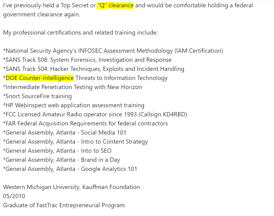 Not a huge leap to assume he knows and does real shit huh? I've long considered "ex" members of the security/intel apparatus to be more dangerous than active ones, for they retain their networks but lose oversight. Who's to say if an intel agent is ever "ex"? Not their assets.
