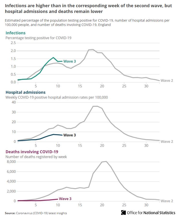 #COVID19 infections are now higher than the corresponding week in the second wave (mid-Nov 2020), but hospital admissions and deaths remain lower.