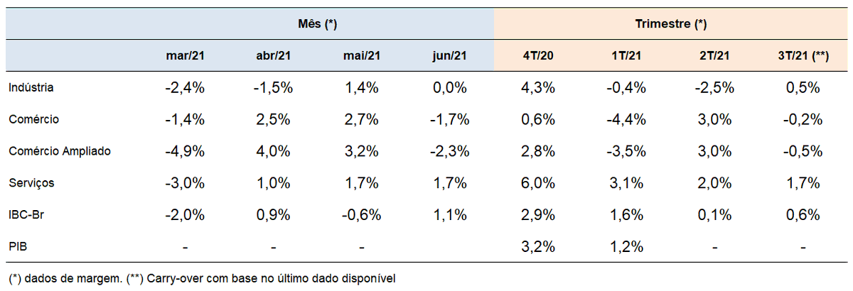 No 2T, destaca-se a recuperação do comércio, depois de fortes quedas no 1T, possivelmente refletindo a volta dos auxílios (e talvez a melhora na 2ª onda).