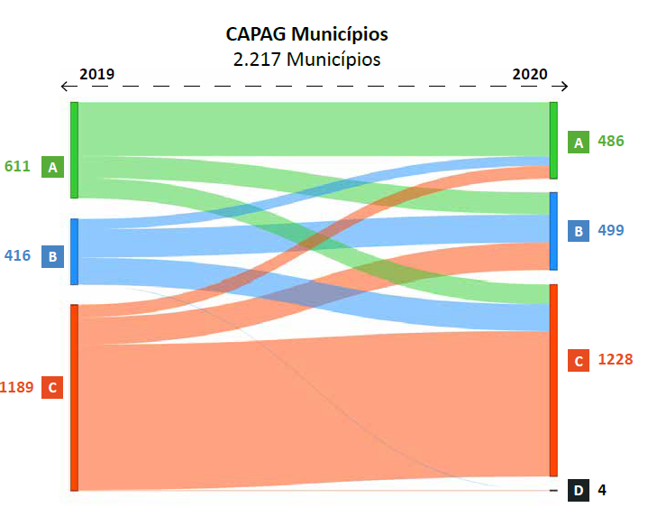 Para municípios que tiveram nota do CAPAG no ano anterior (2,2 mil), já tinha havido uma piora entre 2018 e 2019, indicado pela queda do número de municípios com nota A e B